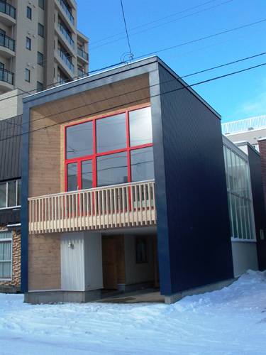 敷地は札幌の市街地にあり、 間口6.6M、奥行16Mの細長い短冊形をしています。 「明るい家を!」との要望に中庭のある町屋を計画しました。 敷地手前を二層、中庭を挟んで奥側を半地下を含めた 三層のスキップフロアにし、中庭を見ながら上下階の移動が できるような構成になっています。 玄関カーポートの上の居間・台所は、 4Mの天井高と開口部のダイナミックな空間になり、 お気に入りのキッチンとコレクションのカラフルな玩具が、 気持ちよさそうに日向ぼっこをしています。 |