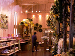 内部は、全て地場のカラ松張りにし、床は、レン氏がこだわった土のイメージの床材を敷きつめ、あくまでもドライフラワーが主役でした。 天窓から降り注ぐやわらかな外光が、レン氏のコンセプトである「森のピクニック」にマッチしています。 |